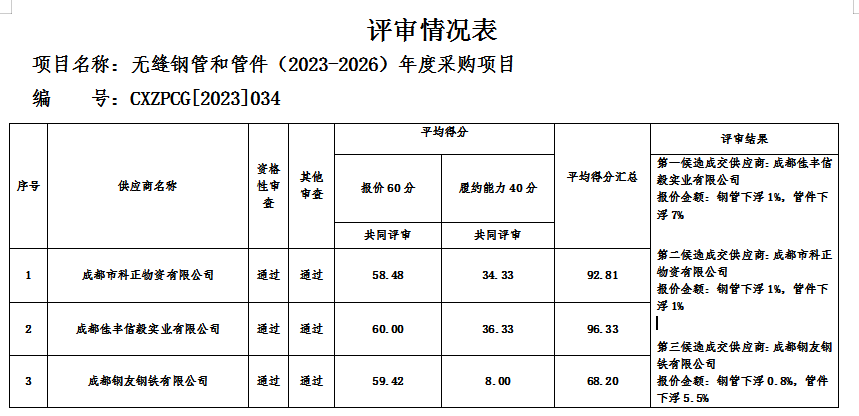 无缝钢管和管件(2023-2026)年度采购项目按照程序于2023年11月13日15时00分进行了竞争性磋商,采购人通过磋商小组推荐的成交候选人名单确定了成交供应商,现将结果公示如下: