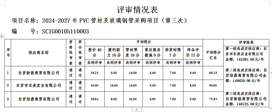 2024-2027年PVC管材及玻璃钢管采购项目(第三次)按照程序于2024年6月12日9时30分进行了竞争性磋商,采购人通过磋商小组推荐的成交候选人确定成交供应商,现将结果公示如下: