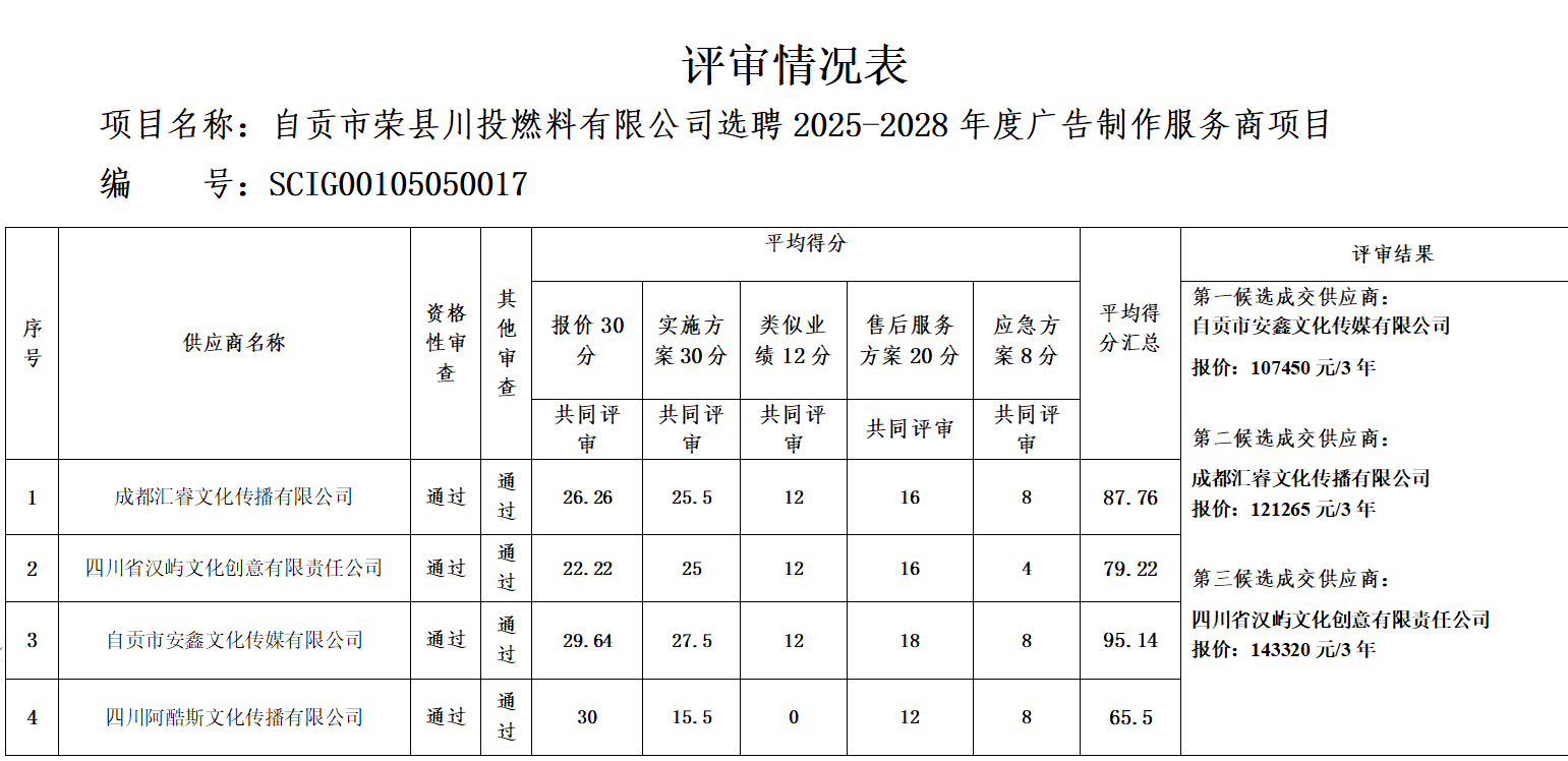 自贡市荣县川投燃料有限公司选聘2025-2028年度广告制作服务商项目按照程序于2025年5月13日10时00分进行了竞争性磋商,采购人通过评审小组推荐的成交候选人,现将结果公示如下: