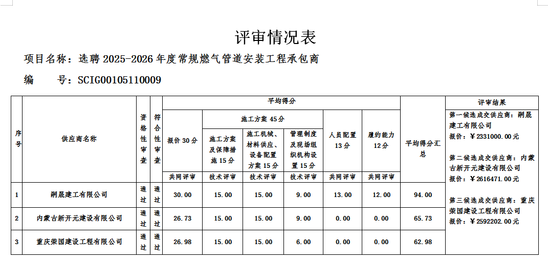 选聘2025-2026年度常规燃气管道安装工程承包商按照程序于2025年5月19日15时00分进行了竞争性磋商,采购人通过评审小组推荐的候选成交供应商,现将结果公示如下: