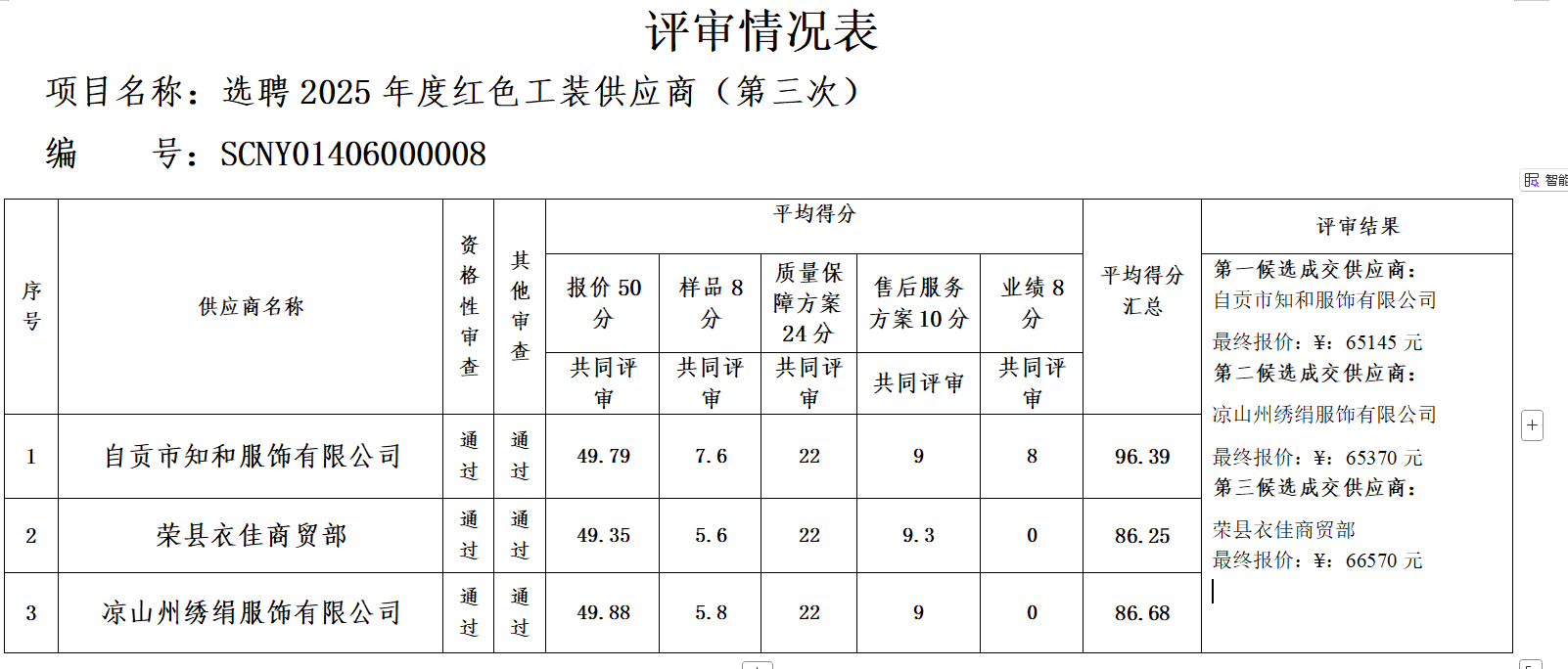 自贡市荣县川投燃料有限公司选聘2025年度红色工装供应商(第三次)按照程序于2025年10月14日10时00分进行了竞争性磋商,采购人通过评审小组推荐的成交候选人,现将结果公示如下: